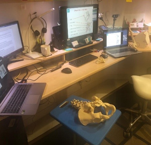 As Comera Movement Science’s Technical Director, Mark has been delivering Kinetic Control Education for more than 25 years; however, his sessions have never quite looked like this before! To ensure that that world class movement education can still be shared across the world, Mark has constructed an efficient, hi-tech teaching environment. Mark has already delivered a number of successful courses and we’ve shared some pictures of ‘Mark’s Mission Control’ below: